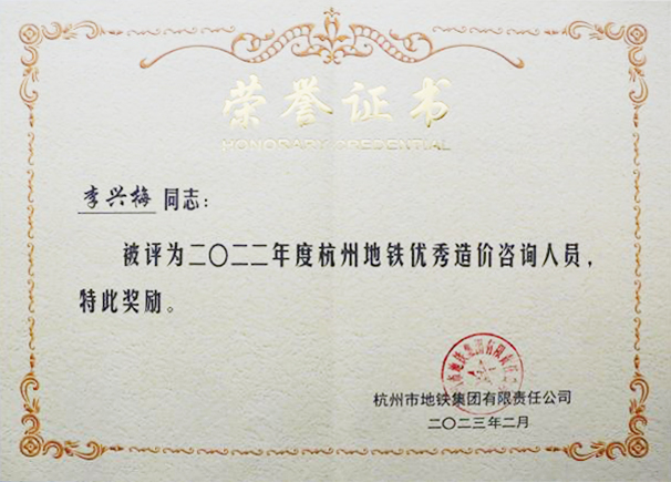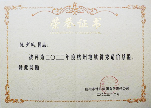 2023年3月2日,杭州地鐵集團召開投資監理工作會議,對參建各投資監理單位2022年度工作進行考核表彰,我司阮少鳳榮獲杭州地鐵建設2022年度優秀造價總監,李興梅榮獲優秀造價咨詢人員,這是她們連續三年榮獲此殊榮。
